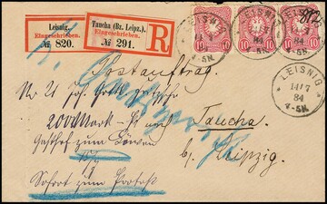 Vier eingeschriebene "Post-Aufträge" der Pfennig-Ausgabe, dabei ein kpl. Vorgang aus Leisnig 1884 mit Weitersendung und zugehörigem grünem Postauftrag (selten!)
