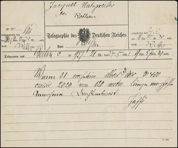 5 Pfg. lila als seltene Einzelfrankatur auf komplettem Telegramm von Berlin 1881 an das Amt Rothau, von dort mit der 5 Pfg. und K1 in den eigenen Landbezirk gelaufen. Seltene Form der Zustellung eines Telegrammes als normaler Landpostbrief in den Landbestellbezirk des Telegraphen-Postamtes. Attest Wiegand