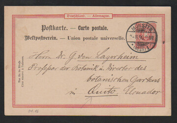 Zwei Ganzsachenkarten 10 Pfg. 1890 mit seltenen Destinationen, von Wiesbaden nach Sao Paulo/Brasilien und von Münster nach Quito/Ecuador (!)