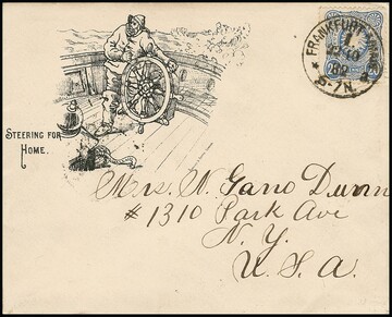 20 Pfg. blau einzeln auf Couvert von Bonn 1883 nach Soerabaya/Java (leicht getönt), sowie auf dekorativem Schmuckumschlag mit Abb. eines Matrosen am Schiffssteuerrad, von Frankfurt 1882 in die USA