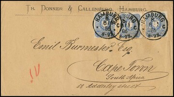 20 Pfg. blau per drei auf Vor-UPU-Couvert von Hamburg 1886 nach Cape Town/Südafrika