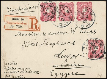 10 Pfg. per vier auf Einschreibecouvert 1888 von Berlin nach Kairo/Ägypten und weitergesandt nach Luxor
