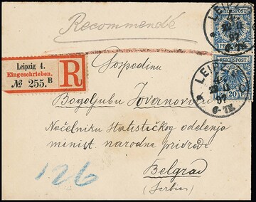 20 Pfge. blau einzeln auf Faltbrief mit Ra3 "Remscheid-Hasten" 1878 nach Sevilla/Spanien, sowie 20 Pfg. Krone-Adler per zwei (etwas über den Rand geklebt) auf Einschreibebrief von Leipzig 1897 nach Belgrad/Serbien