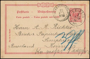 Sechs Belege mit unterschiedlichen Rußland-Destinationen, je dreimal Pfennig (u.a. Retourkarte nach Riga) und dreimal Krone-Adler, dabei seltene Bedarfskarte auf die Krim, sowie R-Brief (kl. Fehler) mit zweimal 20 Pfg., dazu zwei weitere Briefe je nach Finnland