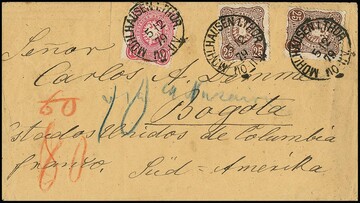 10 Pfge. rosa und zweimal 25 Pfge. braun auf Couvert mit K1 "Mühlhausen/Thür. 5/12 79" nach Bogota/Kolumbien, min. Beförderungsspuren. Eine seltene Destination