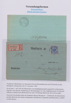20 Pfg. als seltene Einzelfrankatur auf Auslands-Rückschein für einen R-Brief von Neustadt/Schwarzwald nach England und von dort zurück (Formular Rißchen)