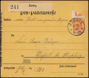 25 Pfg. mit Teil des Oberrandes ("5,00") einzeln, sowie per zwei als Mehrfach-Frankatur, auf zwei Inlands-Paketkarten, übliche Gebrauchsspuren, für EF Nr. 49b Fotoexp. Wiegand, dazu weitere EF Nr. 49b auf Orts-R-Brief von Leipzig nach Gohlis, sign. Jäschke-L.