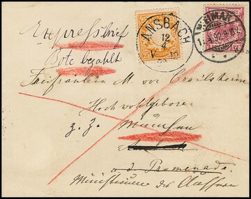 10 Pfg. auf Couvert von Weimar 1892 nach Ansbach/Bayern, von dort mit bayerischer 25 Pfg. orange per Expreß weitergesandt nach München. Zwischen der Reichspost und Bayern bestand Wechselverkehr, so dass die Nachsendung portofrei war und nur die Zusatzleistung "Expreß" nachfrankiert werden musste