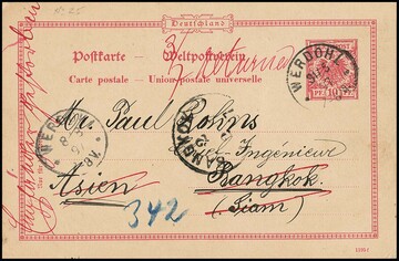 Vier Krone-Adler-Ganzsachenkarten 10 Pfg. mit seltenen Destinationen: 1890 nach Cairo/Ägypten, 1897 nach Bangkok/Siam und retour (! Laufzeit drei Monate), 1898 nach Deli/Sumatra und 1899 nach Rammö/Finnland