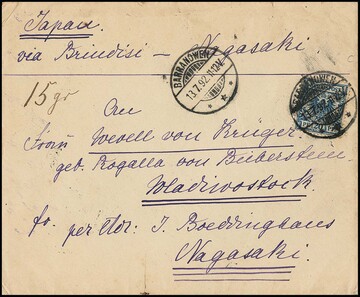 20 Pfg. kobaltblau einzeln auf Couvert (Gebrauchsspuren) von Barranowen 1892 über Singapur nach Nagasaki/Japan zur Weitersendung nach Wladiwostok, also eine äussert seltene Postverbindung! (Laufweg ca. 15.000 km!)
