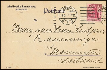 10 Pfg. dunkelrosarot, Friedensdruck, sehr seltene Einzelfrankatur in tadelloser Erhaltung auf Auslands-Postkarte von Hannover 1914 nach Holland. Mi. für Einzelfrankatur "-.-", für die häufigere Mischfrankatur schon 6000,-, Attest Jäschke-L.