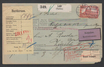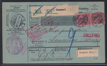 80 Pfg. Germania o. Wz. im Paar als Mehrfach-Frankatur auf kpl. Auslands-Paketkarte von Giessen 1903 in die Schweiz