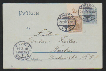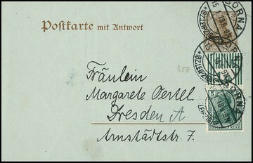 5 Pfg. schwarzopalgrün, Oberrandstück Walzendruck, WOR "3`7`3", Mi. lose gestempelt 900,-, auf Ganzsachenkarte 3 Pfg. am Ersttag (!), 15.1.1918 verwendet, aus Borna, ungewöhnlich
