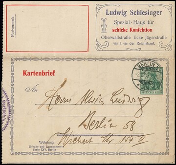 5 Pfg. Germania, seltene Kartenbrief-Werbe-Ganzsache mit vs. und rs. reichhaltigem Firmen-Werbezudruck verschiedener Berliner Firmen gebraucht (unbed. Gebrauchsspuren) aus Berlin 1907