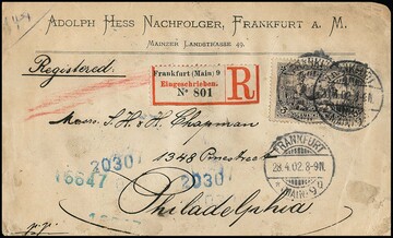 3 Mk., gute A-Zähnung, als portogerechte Einzelfrankatur auf Übersee-R-Brief (entsprechende deutliche Gebrauchserhaltung) von Frankfurt, 28.4.1902, nach Philadelphia/USA. Porto 280 Pfg. bei 210gr. plus 20 Pfg. Einschreiben = 300 Pfg., im Michel nur mit "-.-" bewertet!