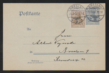 3 Pfg. mit Plattenfehler "DFUTSCHES" auf sauberer 2 Pfg.-Orts-Ganzsachenkarte aus Breslau 1907. Mi. 190,-