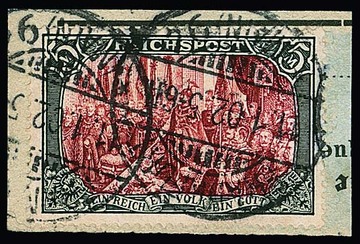 5 Mk. Reichspost, bessere Type IV, auf tadellosem Briefstück, Attest Jäschke-L. Mi. 800,-