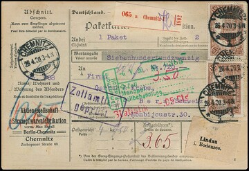 1,50 Mk. braun, gute Farbe per zehn, teils in Einheiten, nebst 15 Pfg. per vier, vs./rs. auf Auslands-Paketkarte von Chemnitz 1920 nach Bern, sign. Peschl, Infla (mehrf.), Mi. 1340,- +