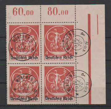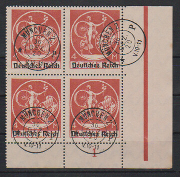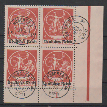 4 Mk. Bayern-Abschied, drei verschiedene gestempelte Bogenecken-Viererblöcke links oben und unten je mit Leerfeldern, sowie rechts unten, je mit Plattennummer. Mi. 250,- + Leerfeld und zwei Pl.-Nr.