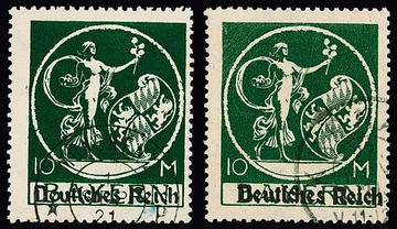 10 Mk. Bayern-Abschied in Typen I (mit Plattenfehler III) und II je gestempelt, sign. Infla, Peschl. Mi. 1150,-
