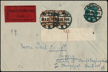 1,50 Mk. a. 1 Mk. mit vollem unteren Bogenrand, dort seltene Platten-Nr. "290" spiegelverkehrt und Passerkreuz (Unterrand vorgefaltet), nebst 60 Pfg. Bayern-Abschied, auf portogerechtem Expreßbrief aus Potsdam, 29.8.21
