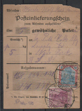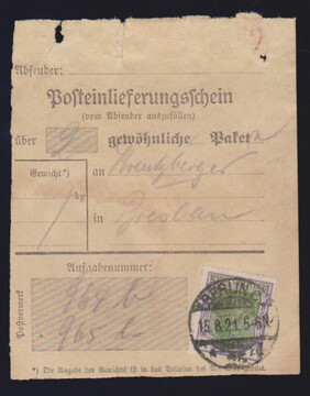 1 Mk. Germania als EF auf Posteinlieferungsschein aus Berlin 1921 (Bef.-Spuren), sowie 120 Pfg. Arbeiter als MeF auf Auslandskarte