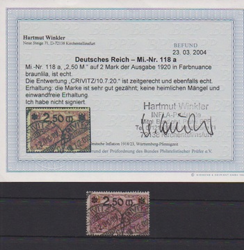 2,50 Mk. a. 2 Mk. braunlila tadellos gest., Fotoexp. Winkler. Mi. 250,-