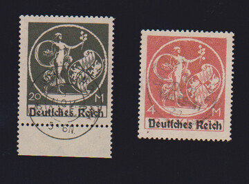 4 Mk. Bayern-Abschied, Plattenfehler IV, sowie 20 Mk. Plattenfehler III ("Keil"), je gest., sign. Infla. Mi. 500,-