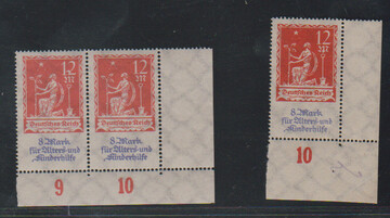 12 Mk. Altershilfe, je postfrische Bogenecken rechts unten mit Plattenfehler, I bzw. III (innerhalb eines Paares), sign. Winkler. Mi. 370,-