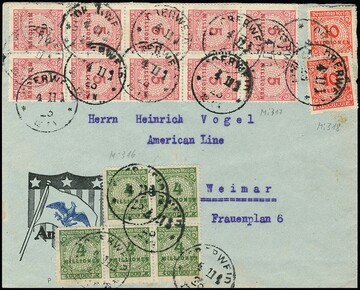 2 Mill. a. 200 Mk. durchstochen im Zehnerblock vom Oberrand rs., nebst vs. 4 Mill. (5), 5 Mill. (10) und 10 Mill. Mk. (2), auf Vordruckbrief von Oberweid nach Weimar. Durch den Brief geht ein Bug, davon sind auch die Marken (u.a. zwei Nr. 309Ba) betroffen, die rechte obere Marke des sehr seltenen Zehnerblocks kleine Fehlstelle, die linke mit sehr seltenem Platten-Oberrand (auf Brief ohne Bewertung), lose gest. schon 1300,-, Rest lose weitere 1800,- Mi. ++
