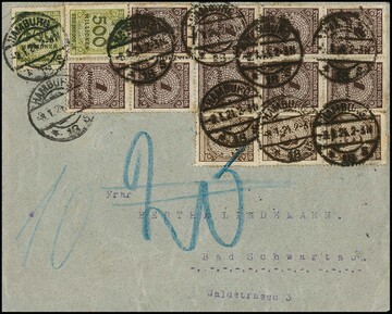 125 T. a. 1000 Mk. dunkelrosa per 17 vorder- und rückseitig auf überfrankiertem Brief von Zell/Harmersbach nach Wolfach, dabei Zehnerblock, wenige Marken getönte Zahnspitzen, mit dieser Marke seltene Massenfrankatur, Attest Fleiner