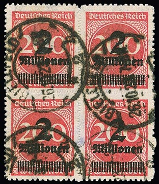 20 Mill. Mk., überdurchschnittlich gut durchstochener Viererblock mit typischem Grobsendungsstempel. Sign. Krause, Peschl, Infla. Mi. lose 1600,- +