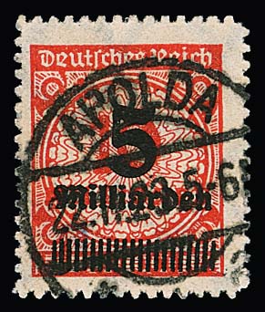 50 Milld. Mk. durchstochen, seltenes gestempeltes senkrechtes Paar, obere Marke vorzüglich erhalten, untere rechts zwei kurze Durchstich-Zungen, Attest Fleiner. Mi. 1800,-
