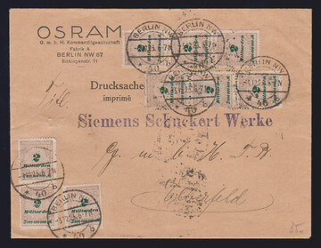 2 Mrd. Mk. Korbdeckel per 15 vs./rs. auf Drucksache, ferner Nr. 327(2), 329A(3) und 335A(3) auf Brief (eine 10 Milld. Mk. mit umgelegter Ecke entwertet), sowie Nr. 328 und Paar 329 auf Postkarte