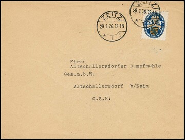 Nothilfe, vier gute Frankaturen: 10 Pfg. per vier als Mehrfach-Frankatur, ferner 20 Pfg. drei Einzelfrankaturen, auf Auslandsbrief 1926 von Zeitz zum Sonderporto in die CSR (selten, Brief leichter Mittelbug ausserhalb), sowie zwei Randstücke je einzeln auf Doppelbriefen