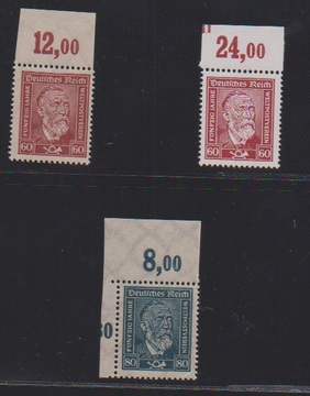 Fünf bessere Belege: Nr. 363 als EF (zweimal, innen und aussen auf dopp. verw. Brief), Nr. 375 (Bogenecke) bis 377 auf Luopbrief, Nr. 525 als MeF per drei, Nr. 598-99 auf Zweittags-Auslandskarte, sowie Nr. 614 auf Auslandskarte