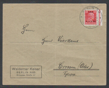 15 Pfg. IAA, rechtes Randstück als portoger. EF auf Brief von Berlin (SST, Couvert Faltspuren ausserhalb) nach Crossen, Mi. 550,- +