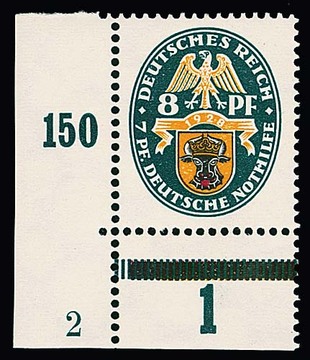 Nothilfe, postfrische Bogenecke-Serie, 8 Pfg. Platten-Nr. "2", 15 Pfg. nur der Rand gering beschnitten, Mi. 240,- +