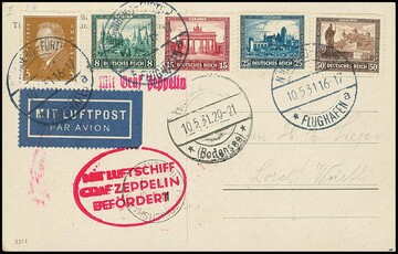 Nothilfe komplett, dabei seltene Nr. 452b, nebst 3 Pfg. Ebert, auf Zeppelinkarte ab Nürnberg, 10.5.1931, um 1 Pfg. überfrankiert (mangels 2 Pfg.-Marke nicht anders möglich), Fotoexp. Schlegel. Mi. 715,-