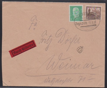 50 Pfg. Nothilfe und 5 Pfg. Hindenburg auf Bahnpost-Expreßbrief 1931 (Stempel "Leipzig-Hof")