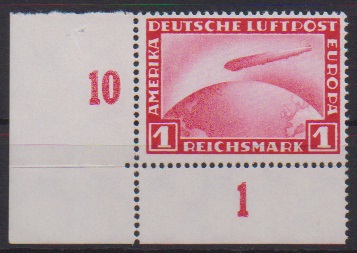1 RM Zeppelin, postfrische linke untere Bogenecke (in der Zähnung vorgefaltet), sign. Schlegel. Mi. 120,-