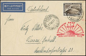 Polarfahrt kpl., auf Zeppelinkarte (leichte Spuren, mit 1 RM) bzw. 2 und 4 RM je auf Zeppelinbriefen, Mi. 1780,-