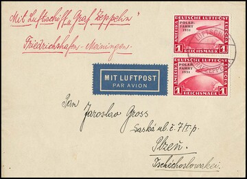 1 Mk. Polarfahrt im Paar auf Zeppelin-Bordpostbrief (Friedrichshafen-Meiningen) bis in die CSR, Mi. 450,-