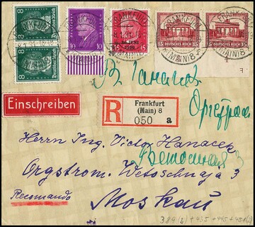 15 Pfg. Nothilfe vom Unterrand mit Druckerzeichen "F" spiegelverkehrt, nebst weiterer Frankatur auf praktisch (1 Pfg. zuviel infolge fehlender passender Wertstufe) portogerechtem Auslands-R-Brief von Frankfurt nach Moskau