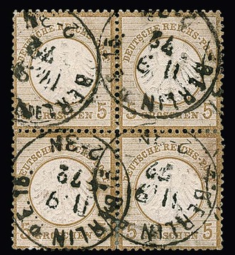 5 Gr. ockerbraun, sauber gestempelter Viererblock mit K1 "Berlin P.E. 15", etwas angetrennt und kleine Mängel, seltene Einheit der kleinen Brustschilde, Mi. 750,-