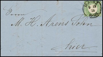 1 Kr. grün (versch. Nuancen), drei Orts-Einzelfrankaturen, auf Orts-Drucksache aus Mannheim (alter K2), sowie auf zwei Ortsbriefen aus Frankfurt (aptierter Franko-K1) und Mainz (Marke im kleineren Format), Mi. 720,-