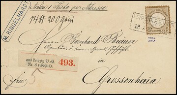 2 Gr. blau, zwei Einzelfrankaturen auf sauberen Paketbegleitbriefen aus Naumburg (K2) und Wittmund (alter Hannover-Ra2), sowie 5 Gr. ockerbraun einzeln auf etwas gereinigtem Paketbrief aus Leipzig. Mi. 750,-
