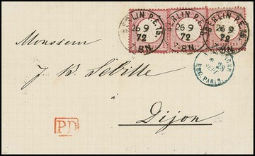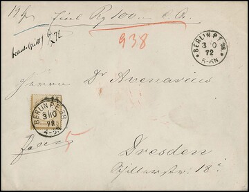 1 Gr. rosa (Eckzahn etwas locker) nebst Kabinettstück 2 Gr. ultramarin auf recommandiertem, rs. nicht vollständigem Brief, adressiert: "Seiner Majestät dem Kaiser von Deutschland und König von Preussen zu Berlin". Klare und zentr. abgeschlagene K2 "Arys 15/3 72", sowie nebengesetzt violetter Ra1 "Recommandirt", rs. blauer Ra3 "Berlin Cabinets-Expedition". Es sind nur wenige Briefe an den Deutschen Kaiser erhalten geblieben