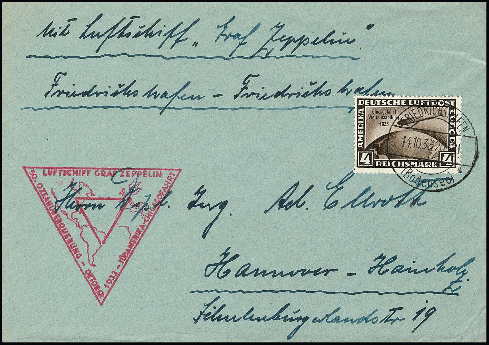 4 RM Chicagofahrt einzeln auf Zeppelinbrief, Chicagofahrt 1933 ab Friedrichshafen, Rundfahrt bis Hannover. Mi. 800,- + Sieger Nr. 238Cba