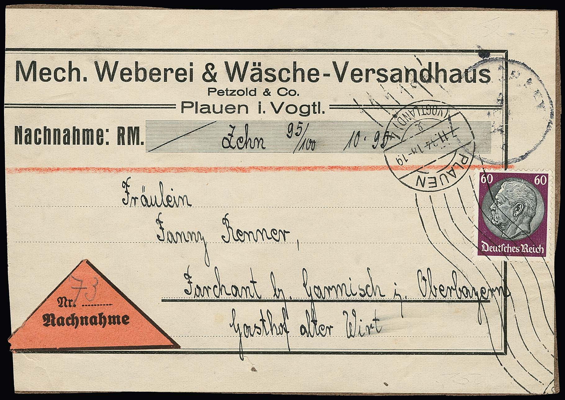 60 Pfg. Hindenburg, zwei sehr seltene Einzelfrankaturen: auf NN-Päckchen-Adresse Inland (Fotoexp. H.D. Schlegel), sowie auf Lupo-Überseebrief (Rostklammerspur ausserhalb) 1933 nach Kapstadt/Südafrika